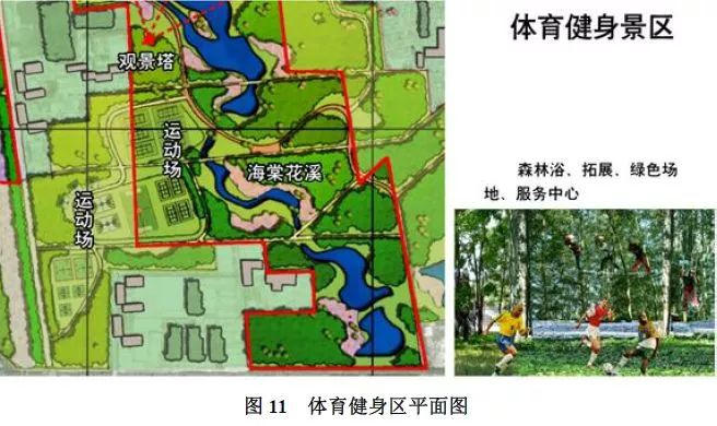 健身娱乐景区位于项目区南侧。健身娱乐区设置多处林中竞技场地及体育设施,给人们提供球类竞技、素质拓展、儿童游乐的好去处,此区域还设置健身步道,为周边居民及游人提供娱乐健身的场所。