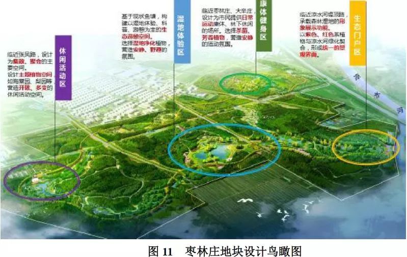 位于张家湾与漷县交接处,西侧紧邻大辛庄、枣林庄,区域内排水干渠枣凤沟纵穿地块。对该地块设计形成四个各具特色的景观分区:生态门户区、康体健身区、湿地体验区、休闲活动区,重点打造主入口张家湾印象、林间康体、莲菱延芳等景观节点。