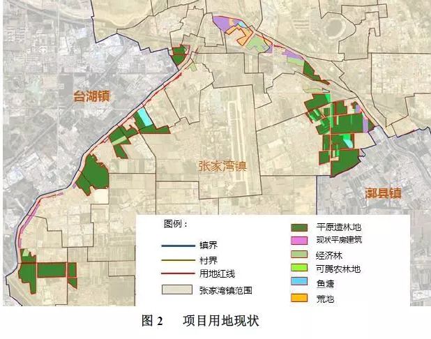 本项目场地为集中块状分布,共涉及张家湾镇19个村,分成十一个分区进行建设。用地主要为现状平原造林地,面积5522.2 亩;在平原造林地基础上,本次新增绿地面积2961.1 亩,主要为现状建筑、经济林、农林地、鱼塘、荒地等,现状平房拆除后恢复绿地。