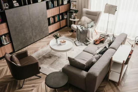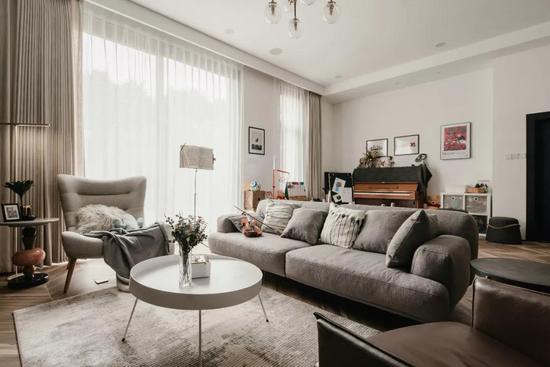 以宽敞舒适的布艺沙发为界,另一半则是属于全家的功能区,纯白的小圆几,简约的地毯,以及两侧的休闲沙发,都体现了屋主追求自然舒适的生活状态。