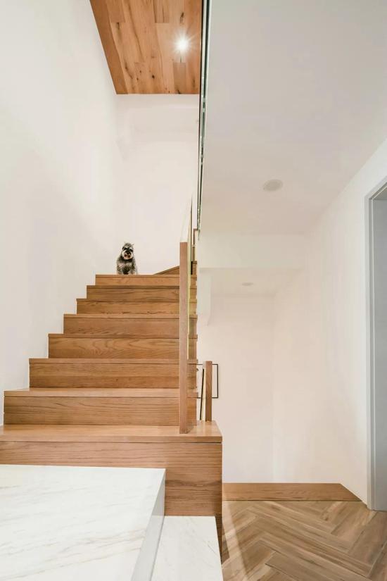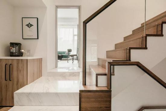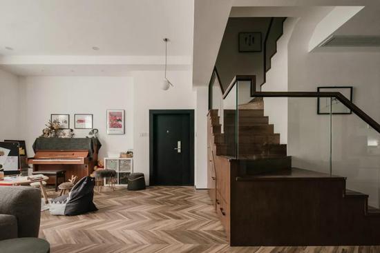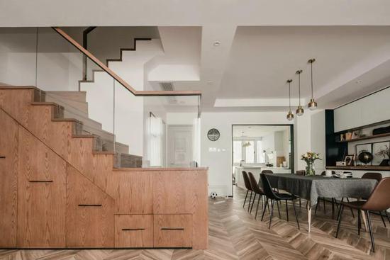 设计师利用楼梯下方的空间打造了一整面的储物柜,一家人常用的鞋子和雨具都可以收纳其中,木质柜门和楼梯材质浑然一体,好看又实用。