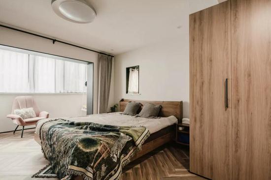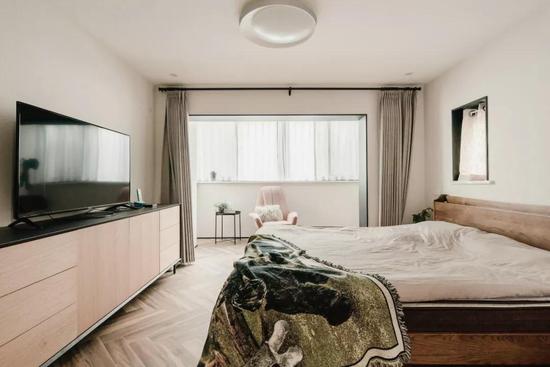 实木大床质朴又有品质,床对面电视柜收纳空间充足,设计师把阳台包入了卧室,带来了更宽敞的休闲空间和更好的采光。