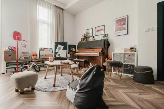 一楼客厅有一半的空间都是属于小朋友的儿童活动区域,屋主心爱的钢琴旁就是宝贝的维尼熊和小黑板,黑板上是小朋友充满童趣的画作。靠墙摆放的收纳组合可以把一些常用的玩具和杂物收的规整,靠墙的穿鞋凳也实用大方。整个儿童活动区给人的感觉是杂而不乱,十分温馨。