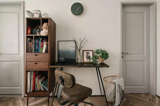 床的对面则是一套黑胡桃红橡木的书柜桌椅组。书柜左右两边的门分别是通往主卫和衣帽间,每扇门后都别有洞天,每个空间彼此独立又互相连接。
