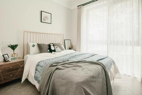 家里还有一间空出来的客卧,方便有亲戚朋友来的时候留宿。黄铜架的床和木质床头柜简约却有质感。床头柜上的绿植和画框也为这个空间点缀了些许生活气息。