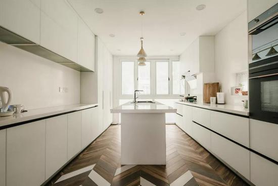 厨房采用通体纯白的储物柜搭配黑色的勾边,明亮又典雅。整面窗的采光性优质,黄铜吊灯下是一个带双水槽的中岛台,整个厨房的动线流畅,空间布局大气,烹饪区在里面比较靠窗的位置,远离餐厅,避免了油烟的烦恼。