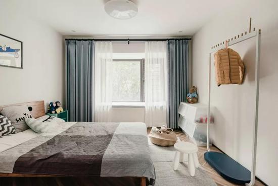 这间屋子是给小朋友的外婆使用的,所以风格上以舒适、质朴为主。进门口处,设计师用承重墙的角度做了个隐藏的衣帽间,充分利用了空间,同时也弱化了承重墙的视觉影响。