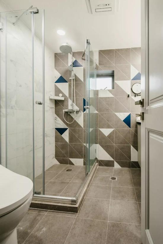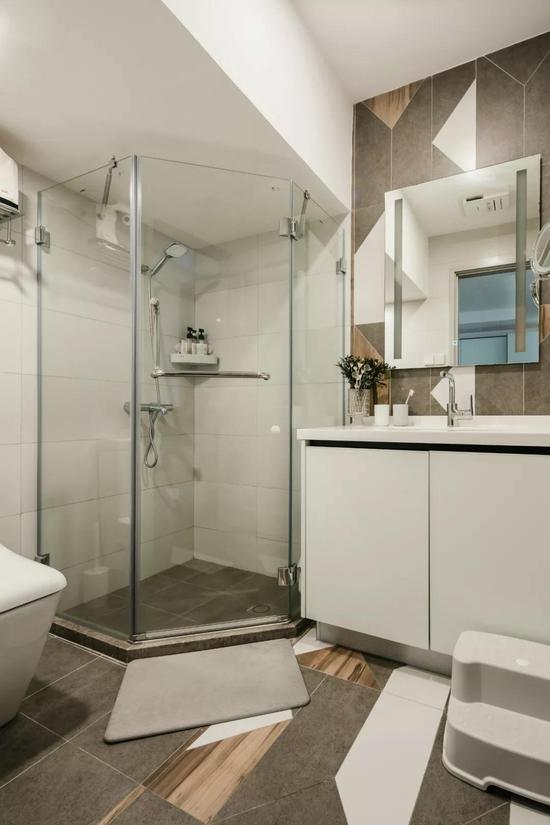 一层客卫干湿分离,地面和洗手台墙面都用了仿木瓷砖,做了不规则拼接,消除沉闷感。