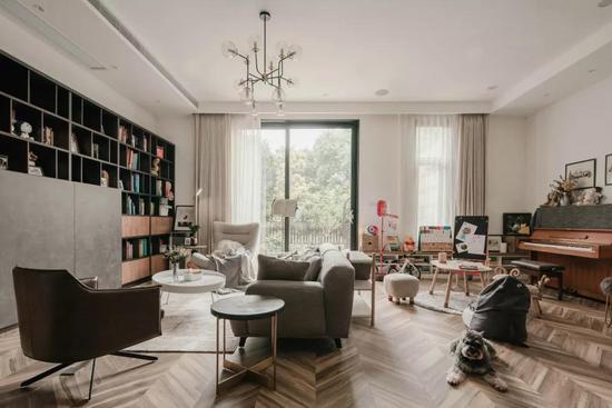 占据了客厅一整面墙的不规则木质书架,既有屋主的藏书,也有小朋友的读物,还有各种手办、玩偶。电视机则隐藏在两扇灰色的推拉木门之后。如果你仔细看的话,会发现穿插在书柜、小茶几上,随处可见的各种相框里,主角都是一只可爱的雪纳瑞狗狗。这只狗狗是陪伴了屋主十余年的心头宝,虽然已经寿终正寝,单给屋主留下了美好的回忆,所以屋主将它摆放在房间各个位置,仿佛它一直都在自己身边。