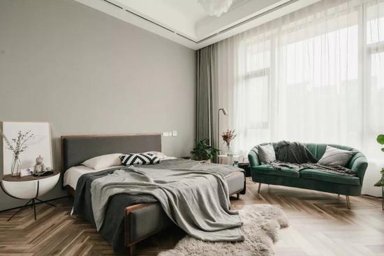 踩着白色大理石台阶就进入了主卧。人字拼接的仿木地砖,浅灰色背景墙,为主卧定下了基调。采光极好的落地窗前是一张深绿色的双人沙发,疲倦时轻靠在上面休息很方便,和卧室里的其他绿植,一起点缀着这个白、灰、木色组成的空间。