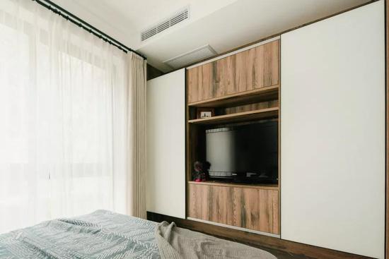 床对面的组合柜集衣柜、电视机柜于一体,空间安排恰到好处。