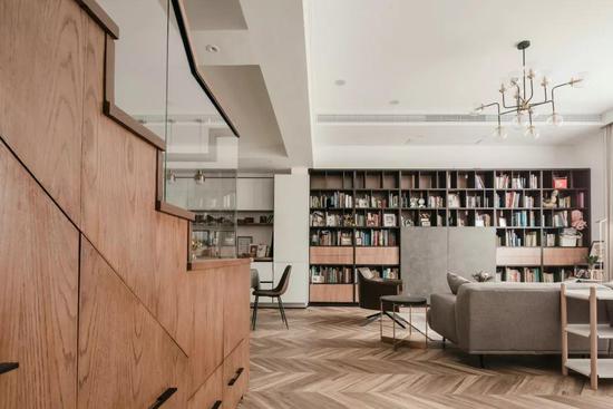 书架墙加储物楼梯 用不常规客厅布局打造温馨亲子房