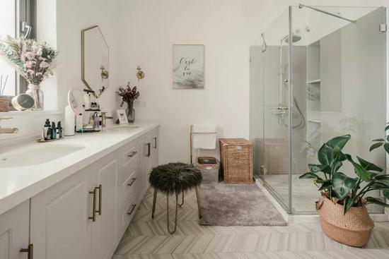 主卫则空间充足,左侧靠窗做了双台盆的台面,这样男女主人就更有自己的一块天地。女主人的化妆台也设置在了这里,下方则是黄铜拉手的白色柜组,储物能力强大。