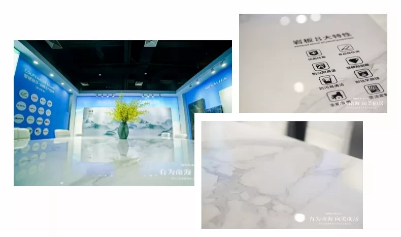 在产品设计方面外,蒙娜丽莎也深耕于全瓷空间一站式解决的运用,除了传统运用于墙地面,还可以运用在橱柜、冰箱、电视柜、茶几、餐桌、岛台等领域,构建以设计美学为基础的“大家居”模式。现场休息会议桌桌面为3600×1800(mm)超大规格岩板打造,行云流水的纹理比传统的木材更加吸睛。
