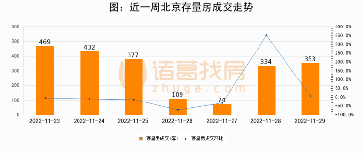 从存量房来看,2022年11月29日北京存量房单日成交353套,比昨日增加19套,环比上涨5.7%。从近一周存量房成交来看,北京存量房日均成交套数为306套,其中11月23日成交量最高为469套,11月29日单日成交353套,高于近一周平均水平15.4%。