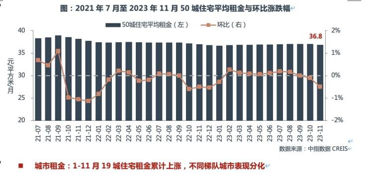 根据中指研究院50城住宅租赁价格指数,今年1-11月,全国重点50城住宅平均租金累计上涨0.18%。11月,50城住宅平均租金为36.8元/平方米/月,环比下跌0.50%,同比下跌0.36%。