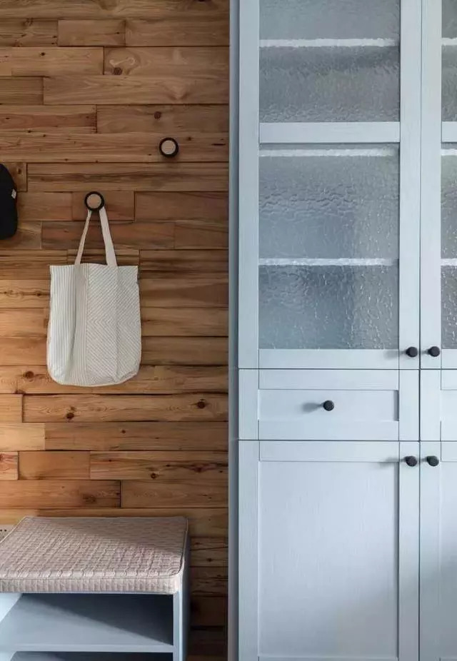 很适合独居的人,平时我起床排名前列件事就是冰箱拿牛奶或者打豆浆,然后坐在餐桌前发呆。依图中所见,入户门右边的实木墙体是旧木板回收制作而成的,赋予了空间新的质感。放置冰箱的位置,其实很早就做好规划,要定制收纳柜。