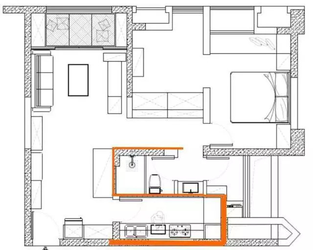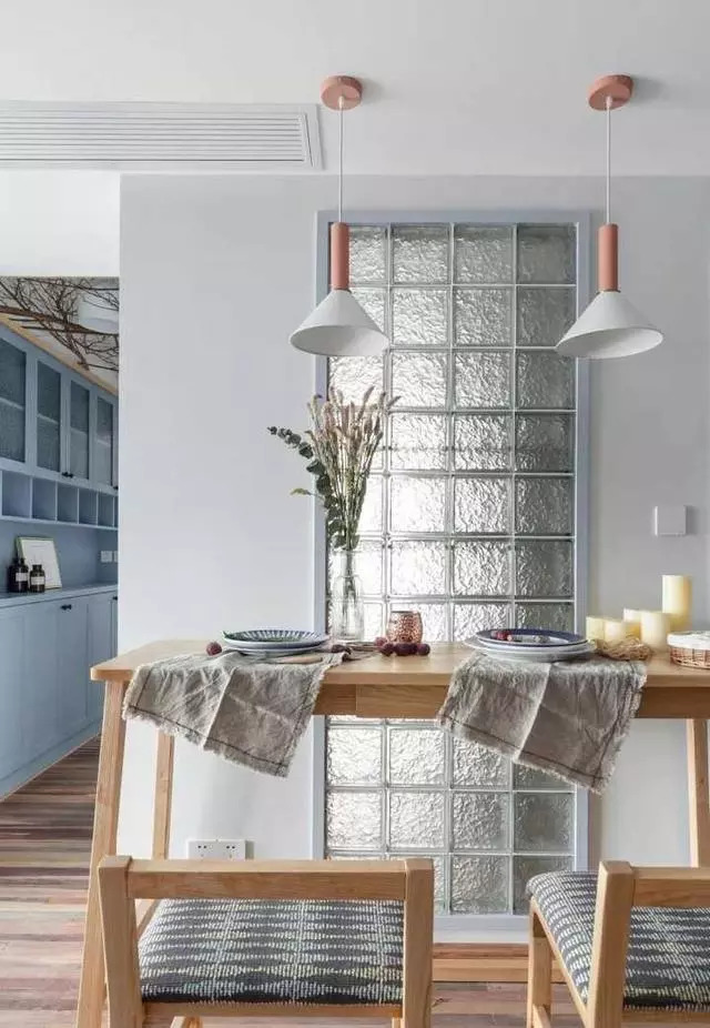 厨房连接卫生间的墙面,原先是实墙,后做成醒目的玻璃砖,加大了厨房的通透感与采光效果。橱柜的颜色依旧延续客厅、卧室的家具的色彩,视觉上更加和谐统一。