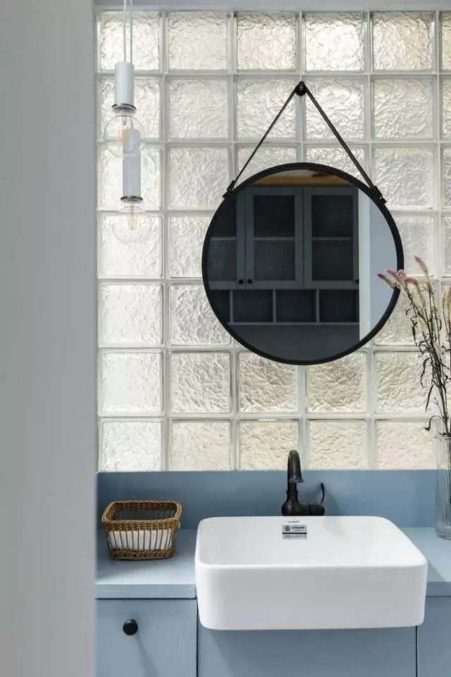 我们看到的玻璃墙砖,就是连接厨房的那面墙。洗漱台上方安装了一高一低的吊灯,更具个性化。