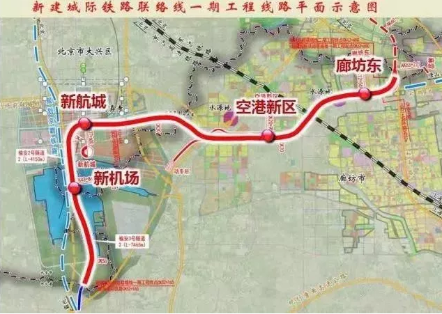 工程分一期、二期建设推进。其中新建城际铁路联络线一期工程起点为河北省廊坊市与北京大兴区采育界,终点为北京大兴区与河北省固安县界,线路长度约39.7km,共设车站4座,分别为廊坊东站、空港新区站、新航城站、新机场站。线路为双线城际铁路,设计时速200公里/小时。