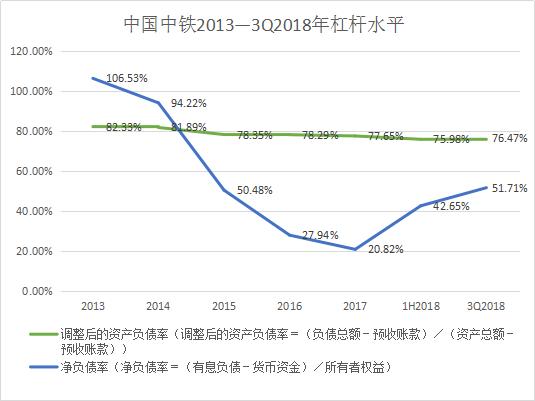 另外,公司净负债率自2013年起逐年大幅下降,从2013年的106.53%降至2017年的20.82%,行业排名下降到1/4分位数之下。2018年上半年中国中铁的净负债率42.65%,截至2018年第三季度,由于有息负债中短期借款和一年内到期的非流动负债的增加,导致中国中铁的净负债率同比上升5.07个百分点至51.71%,仍处于行业较低位置。