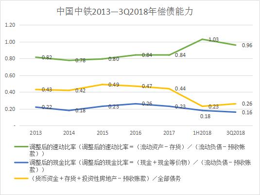 长期偿债能力方面,通过“(货币资金+存货+投资性房地产-预收账款)/全部债务”指标来分析企业的长期偿债能力。2018年上半年中国中铁的该项指标同比下降47.7%降至0.23,低于标准排名统计的100家上市房企的1/4分位数0.5。2018年第三季度,指标稍有回升至0.26。根据其行业排名,中国中铁表现出较差的长期偿债能力。
