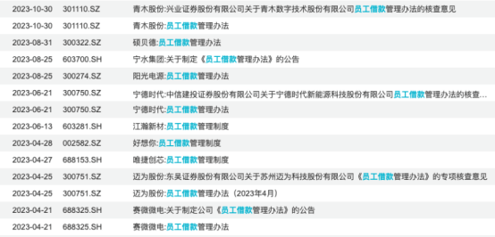 除上述两家公司外,据证券时报·e公司记者统计,今年以来还有赛微微电、迈为股份、唯捷创芯、万泽股份、好想你、江瀚新材、宁德时代、阳光电源、宁水集团、硕贝德等A股公司披露了《员工借款管理办法》。