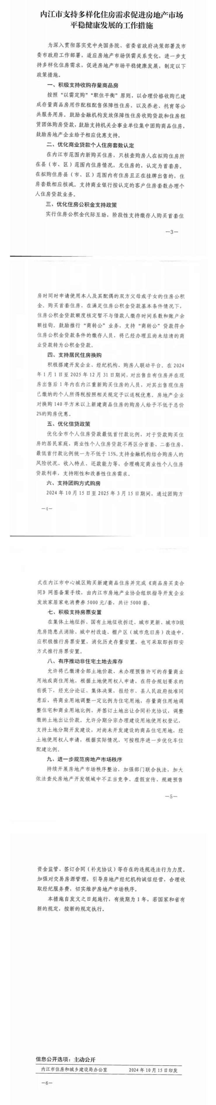 10月15日,四川省内江市住房和城乡建设局等7部门联合印发《内江市支持多样化住房需求促进房地产市场平稳健康发展的工作措施》。