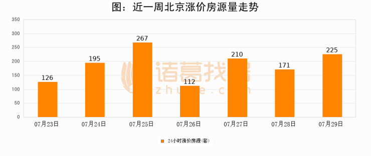 根据诸葛找房数据显示,北京24小时涨价房源量为225套,较07月28日增加54套,环比上涨31.6%。与此同时,涨价房源占比小幅扩大,业主信心有所提升。