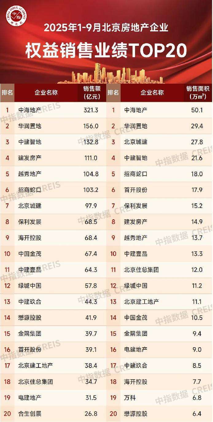 今年前三季度,北京楼市在政策优化与市场调整的双重作用下,上演了一场关于产品力、资金实力的全面较量。据中指研究院发布的全口径房企销售金额榜单,1-9月份,8家房企销售额超过百亿,中海地产、华润置地、越秀地产位列前三。