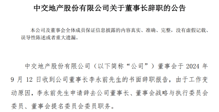 9月13日晚间,中交地产(SZ000736,股价8.16元,市值60.96亿元)发布公告,董事会于2024年9月12日收到公司董事长李永前的书面辞职报告,由于工作变动原因,李永前申请辞去公司董事长、董事会战略与执行委员会委员、董事会提名委员会委员职务。