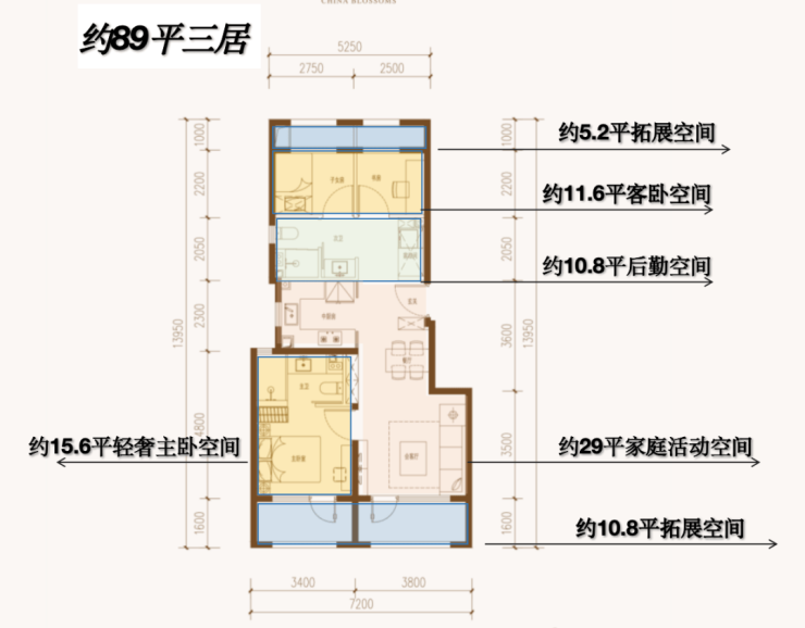 户型南向面宽约7.2米,南北均有拓展空间,加起来差不多有15平以上,让客厅与卧室相较市场同类产品更为宽敞。