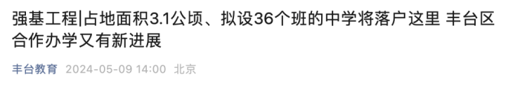 近日,丰台教委消息,丰台羊坊教育地块与北京大学附属中学开展合作办学,规划落地一所36班中学,规划占地面积3.1公顷。