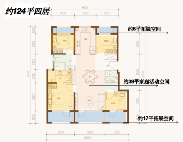 建面约124㎡四室两厅两卫南北都有拓展空间,超高得房率可以达到93%,使用面积情况可以PK市面建面约140平户型。