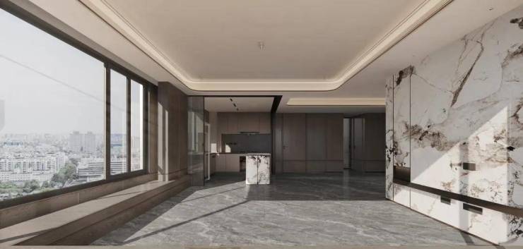 最后,通过空间色彩的搭配、线条的极简处理,将吊顶的金属装饰线、石膏造型、岩板碰撞吊顶的收口封边、踢脚线等收窄,弱化硬朗粗壮的边角,实现整体通透高级的空间舒适感。