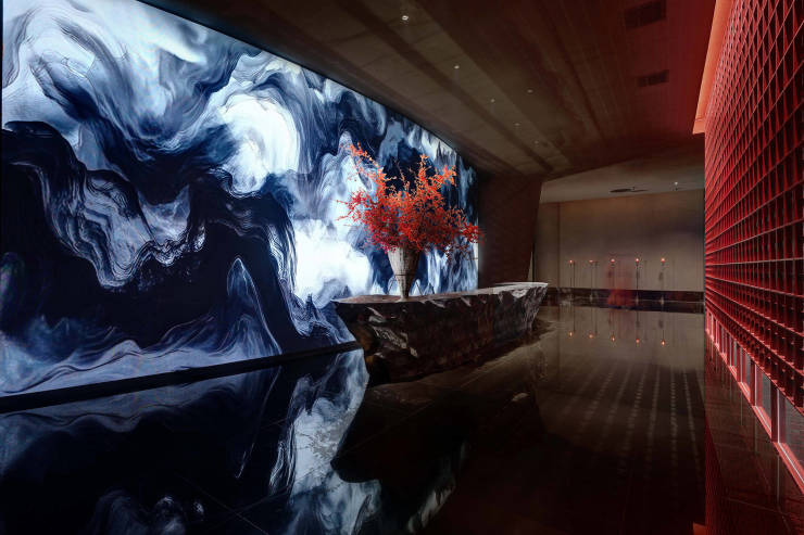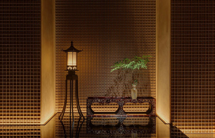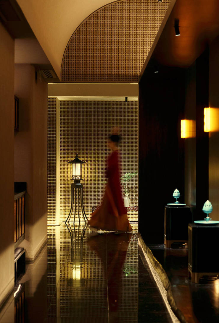 从入口的云中殿,到换装区-宴会厅,空间遵循“丝滑连接”的现代建筑准则:弧线过渡的隔墙、无棱角的材质衔接、隐藏式灯光系统,确保宾客动线的流畅沉浸。而在细节处,传统美学的“留白”与“意境”被巧妙植入,这种设计逻辑使空间既服务于沉浸体验的功能性(如动线引导、场景转换),又通过“现代形制+传统意境”的融合。