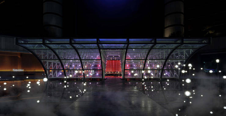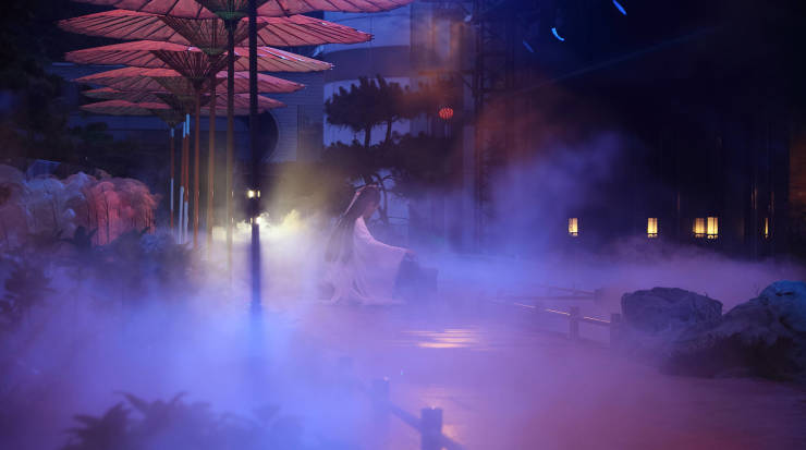 传统剧场中泾渭分明的“观众席”在此转化为300个分布式舞台单元:宾客座位区通过灯光系统与主舞台形成动态联动——当主舞台演绎《诗经》篇章时,座位区的地灯化作“流萤”随韵律明灭;演绎宋代雅集时,环形坐席的光效转为暖黄,模拟宫灯映照的宴饮氛围。这种设计使每个座位既是观演点,亦是光影叙事的组成部分,宾客的举手投足皆融入场景,打破“看与被看”的物理隔阂。