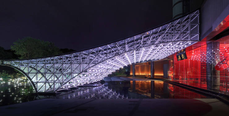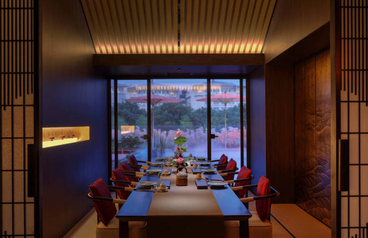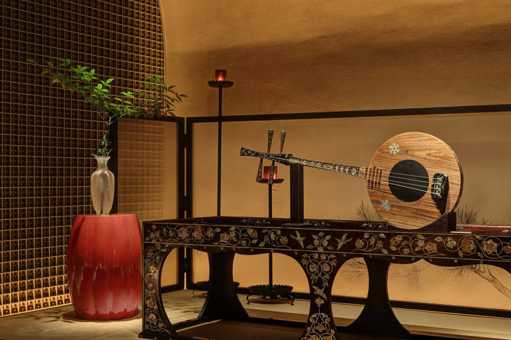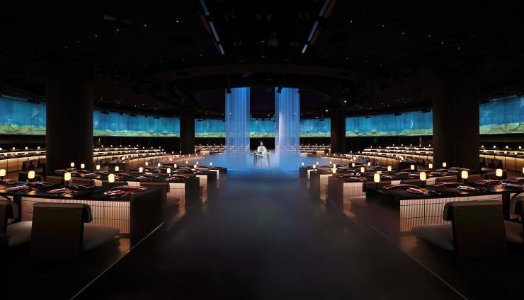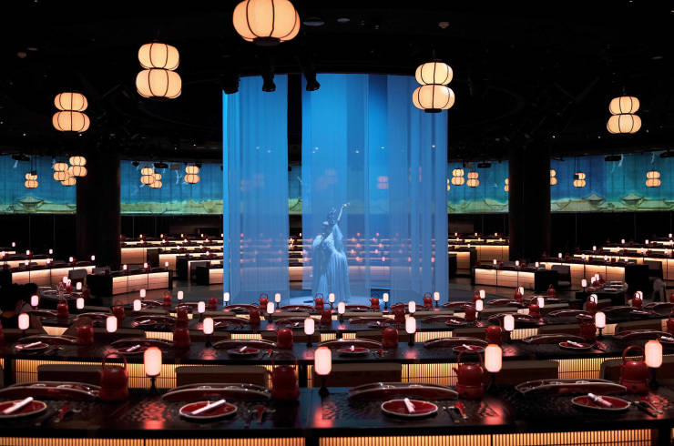 空间设计既非对古典形制的复刻,亦非纯粹现代主义的极简表达,而是通过建筑、光影、数字技术的协同,让传统文明以可感知的当代形态“流动”于空间之中——从360度动态《瑞鹤图》的穹顶叙事,到餐盘上的微型历史剧场,再到极简线条勾勒的坛城式空间秩序,最终构建出“一步一景皆历史,一餐一食尽文化”的沉浸式体验场域。