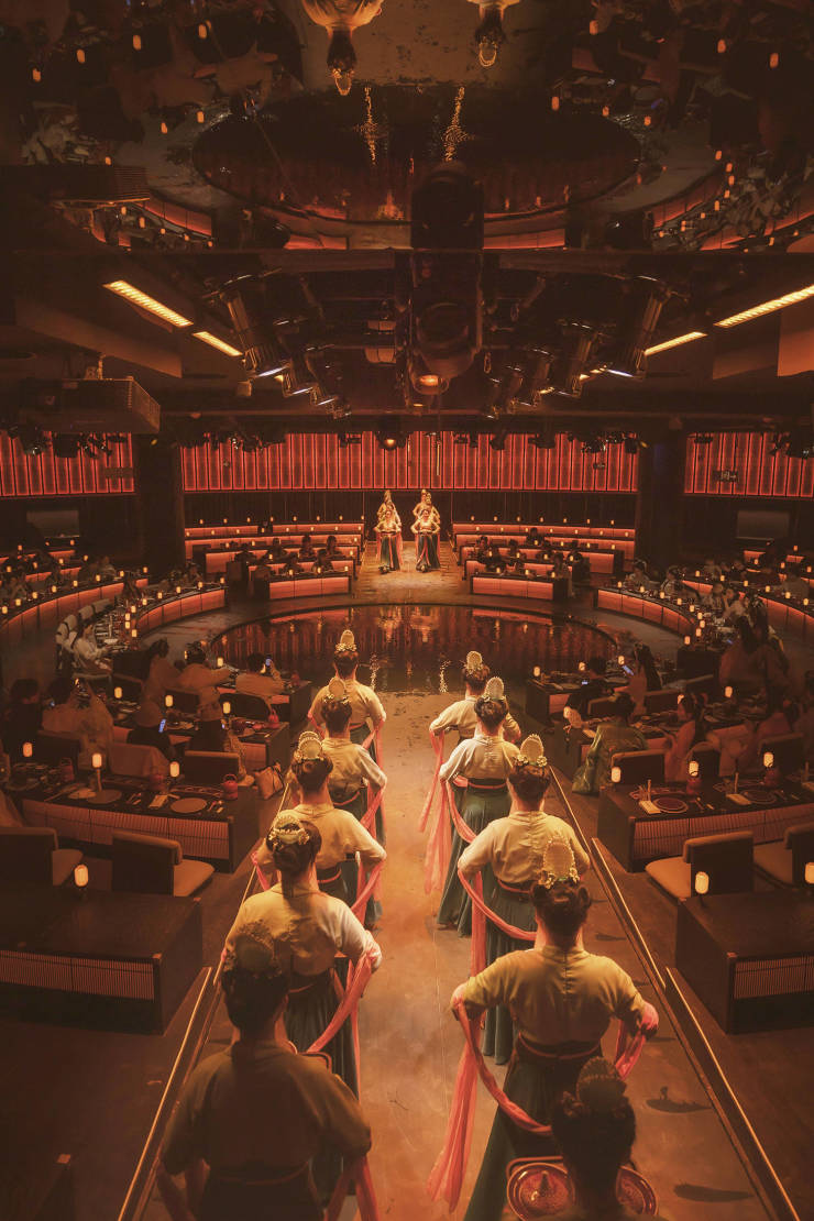 宫宴的设计突破了传统餐饮与剧场的边界,以“沉浸式文化容器”为载体,将唐宋美学基因与当代剧场技术进行精密重组。不同于传统剧院“观众-舞台”的二元割裂,这里每位身着汉服的宾客既是宴会参与者,亦是文化叙事的“活态元素”;