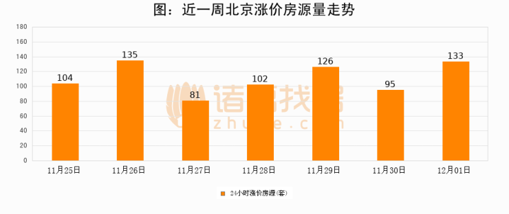 根据诸葛找房数据显示,北京24小时涨价房源量为133套,较11月30日增加38套,环比上涨40%。与此同时,涨价房源占比小幅扩大,业主信心有所提升。