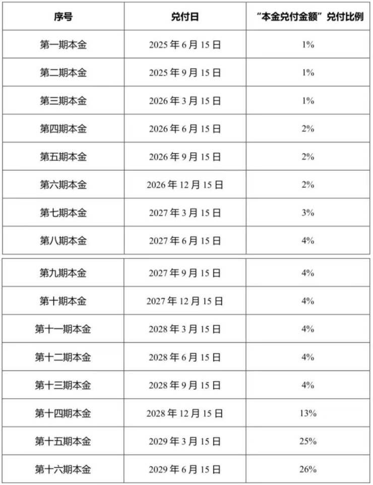 世茂建设已经于2023年9月15日和2024年3月15日分别向每个证券账户兑付其持有的本期债券各不超过100张。在兑付日调整期间,除上述小额兑付安排以外,本期债券的本金将分16期兑付,首期1%的本金兑付时间为2024年6月15日,最后一期26%的本金兑付时间为2028年6月25日。截至目前,世茂建设并未支付首期兑付资金,该债券有30个连续交易日期限的宽限期,目前处于支付宽限期。