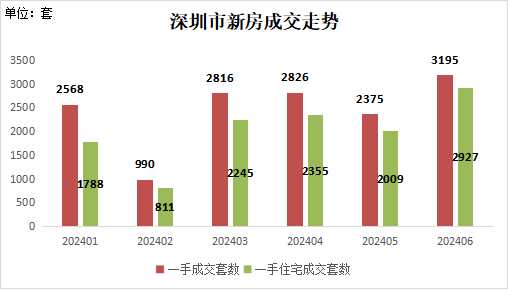 6月,深圳新房住宅成交量环比增长46%,但2024年上半年数据同、环比仍呈下降态势。