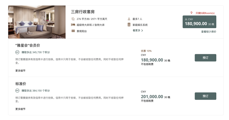 据上海雅诗阁衡山服务公寓预订官网,以2024年4月24日-5月24日期间为例,119平方米的一房行政套房30晚的标准价为8万元,“雅星会”会员价为7.2万元;142平方米的两房豪华套房30晚的标准价为12.9万元,会员价为11.61万元;190平方米的三房豪华套房30晚的标准价为17.1万元,会员价为15.39万元,目前显示仅剩2间。276平方米的三房行政套房30晚的标准价显示达20.1万元,会员价为18.09万元,当前仅剩5间。
