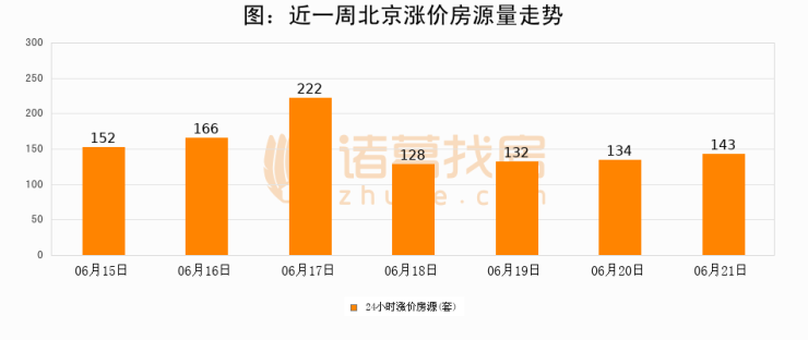 根据诸葛找房数据显示,北京24小时涨价房源量为143套,较06月20日增加9套,环比上涨6.7%。与此同时,涨价房源占比小幅扩大,业主信心有所提升。