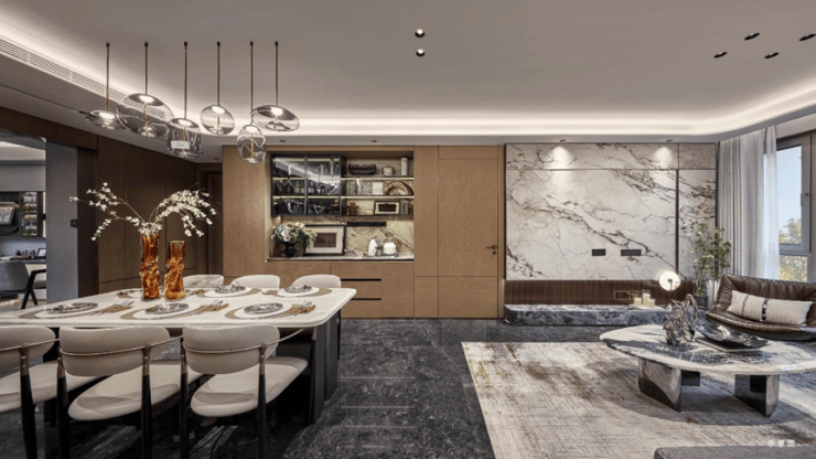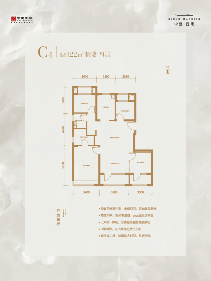 中建・云境1#楼选择用“四叶草格局”破局。四个卧室分布在户型四角,老人房远离客厅动线,孩子写作业时不受家人看电视的干扰,主卧套间则保障了主人的私密空间,彻底避免 “一家人互相影响”的尴尬;客餐厅一体化连通南向景观,孩子能在客厅跑着玩,家人聚餐时也能看见窗外的风景,既开阔又温馨。