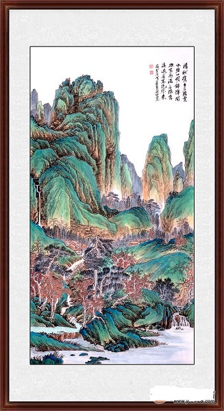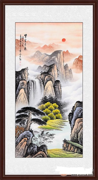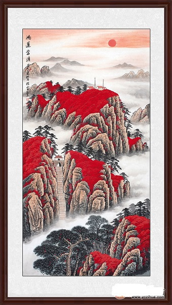 玄关素来就是一个藏风纳气的地方,对于家中的风水影响颇大,所以一幅好的玄关风水画是尤为重要的,李林宏这幅鸿运当头山水画以朱砂红点缀各个山头,描绘出万山红遍的景象,犹如一个个跳动的红精灵,吉祥如意,红日当空,浩然云雾充斥山涧,祥瑞之兆,山上的松树有着招财迎客挡灾的寓意,步步高升的登山道,这样好风水的山水画挂在玄关较佳。