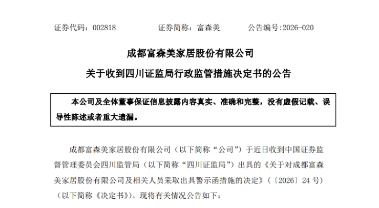 从家居卖场龙头富森美因内控与财务核算问题收到警示函,到家居制造企业菲林格尔因财报虚假记载遭监管责令改正,再到喜临门及其实控人因资金占用与信披违规被立案调查,叠加*ST建艺、法狮龙等企业接连暴露的治理与财务风险,行业合规风险集中释放。
