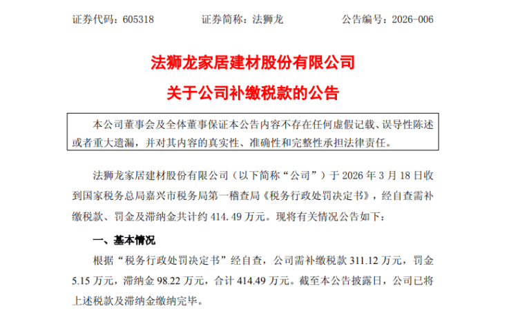 法狮龙3月18日因税务违规,被嘉兴市税务局要求补缴税款、罚金及滞纳金合计414.49万元,目前已完成全部款项缴纳及整改工作。