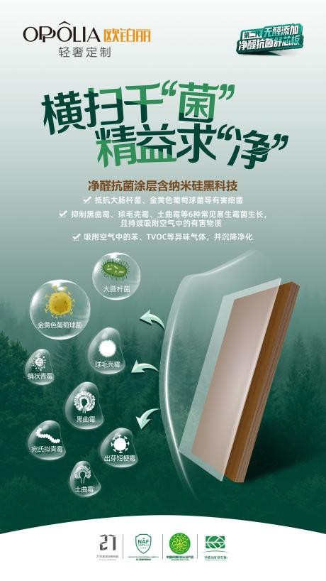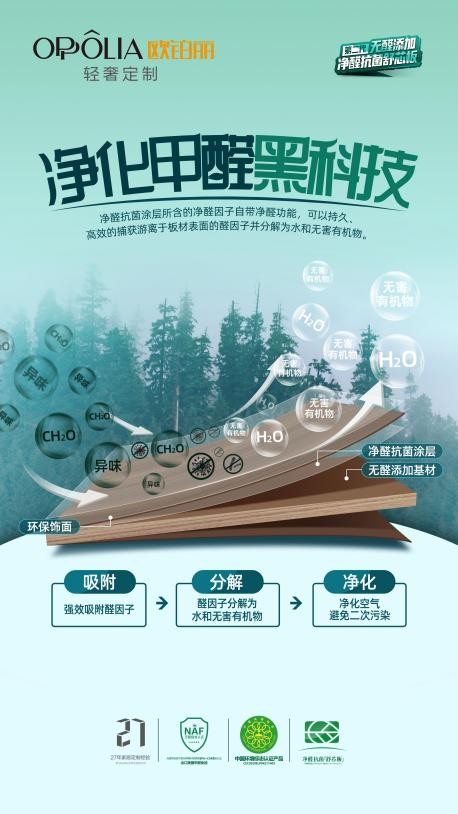 2021年,欧铂丽秉承着严苛态度及服务标准,全力打造E0级高标准环保板材,引入净醛抗菌技术,在基材无醛添加的基础上,新增创新研发的净醛抗菌涂层,推出净醛抗菌舒芯板。净醛抗菌舒芯板所含的净醛因子和纳米硅黑科技,可实现净醛+抗菌+防霉+净味多重硬核功能,且环保标准远高于欧标、新国标,让每一个入住的家庭,都能享受到环保带来的安心、舒心、与健康生活。