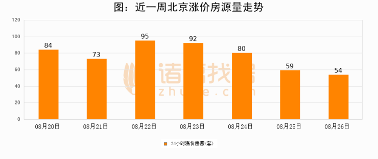 根据诸葛找房数据显示,北京24小时涨价房源量为54套,较08月25日减少5套,环比下降8.5%。与此同时,涨价房源占比小幅回落,对于购房者来说是一个入市窗口期,购房者可抓住时机入市。